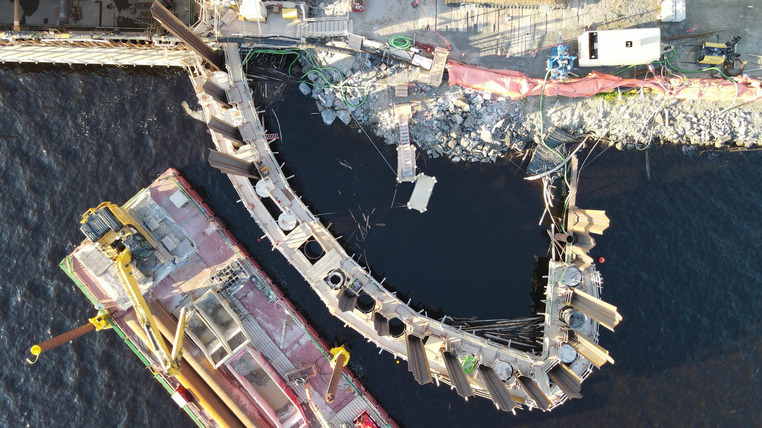 Ces murs combinés (combi-wall) sont constitués de palplanches et de pieux caissons, et leur système de soutien repose sur des ancrages permanents au roc. La nature du sol, composée d’un roc très compétent, a nécessité l’utilisation de techniques avancées, dont le cluster drill.