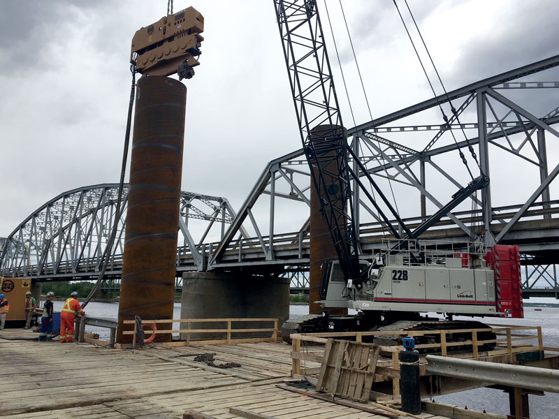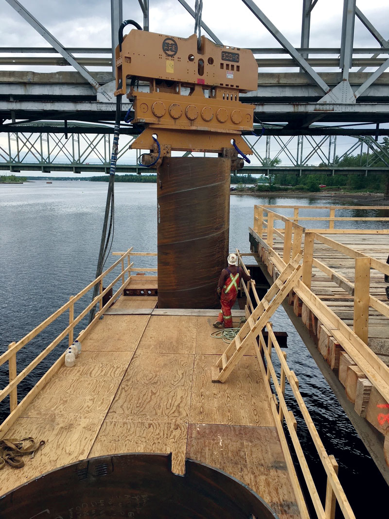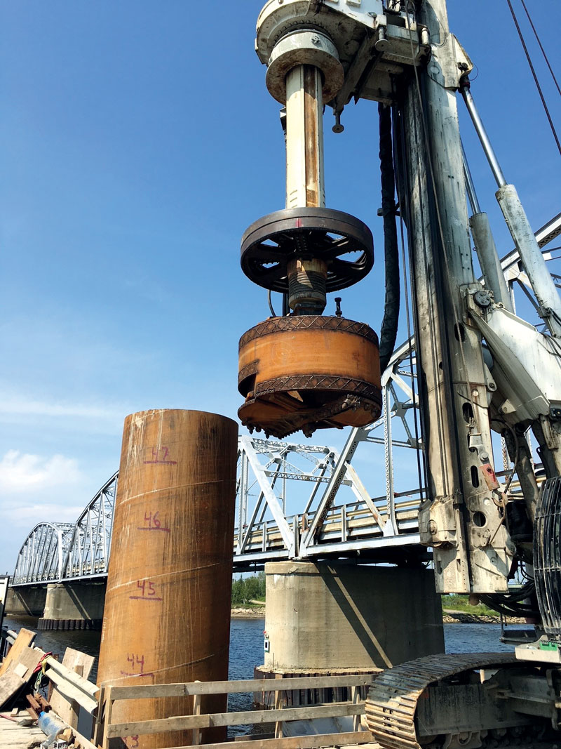 Les travaux ont inclus l’installation de 10 pieux caissons de 2 m de diamètre, atteignant des profondeurs allant jusqu’à 235 pi par caisson, incluant l’emboîture. Ces pieux massifs assurent la stabilité et la durabilité du pont en ancrant solidement sa structure dans le sol, malgré les défis posés par les conditions géotechniques locales.